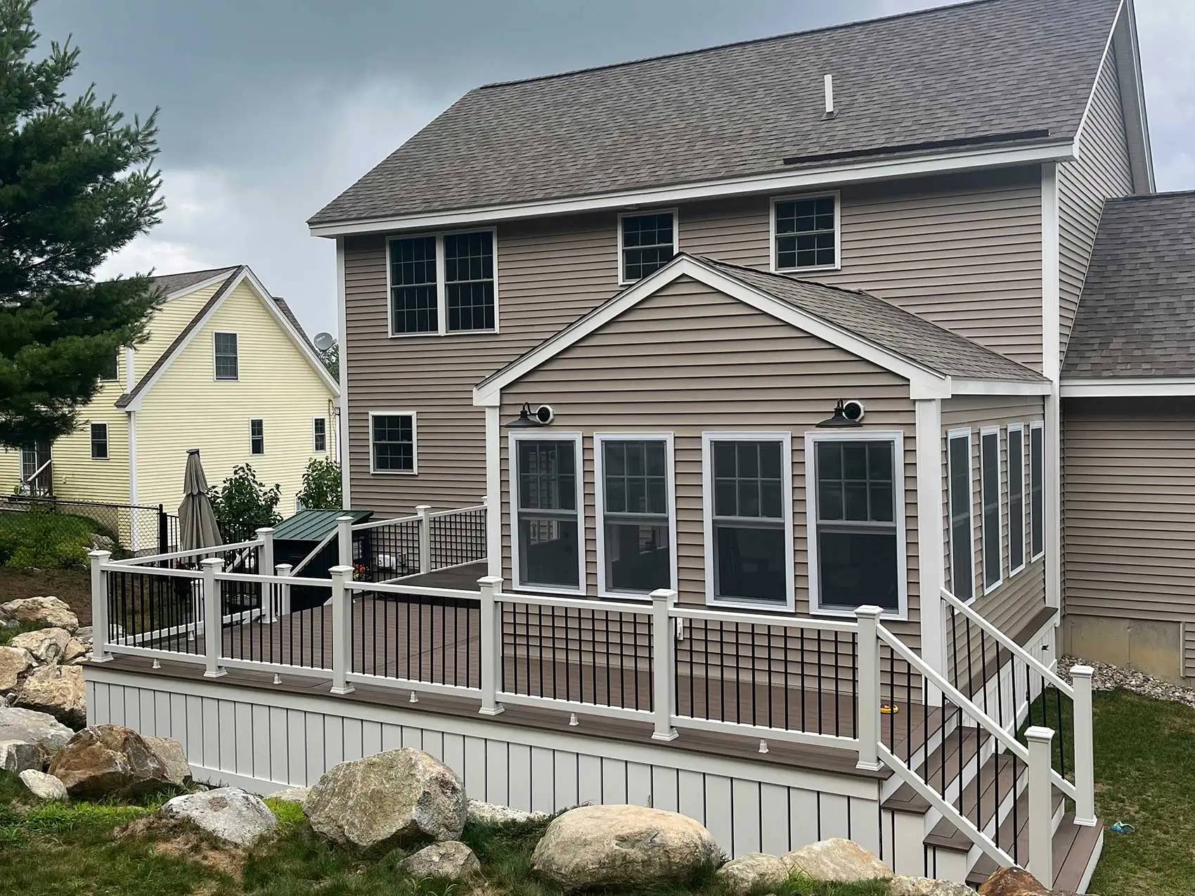 custom deck builder, composite deck installation, Azek deck builder, TimberTech deck contractor, porch builder, front porch construction, wraparound porch builder, three season room contractor, screened-in porch builder, outdoor living contractor, multi-level deck builder, poolside deck construction, deck renovation contractor, deck replacement services, deck design and build, custom outdoor spaces, backyard renovation contractor, exterior home improvements, rooftop deck builder, spiral staircase deck, raised deck with drainage system, HOA deck repair specialist, property manager deck contractor, free deck structural evaluation, deck framing contractor